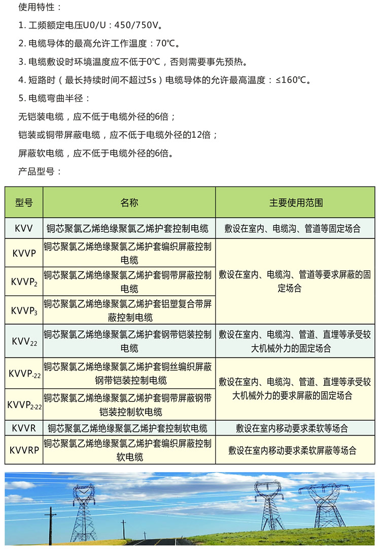 二、使用范圍 聚氯乙烯絕緣聚氯乙烯護(hù)套控制電纜適用于額定電壓450/750v及以控制、信號(hào)、保護(hù)及測(cè)量系統(tǒng)接線之用。