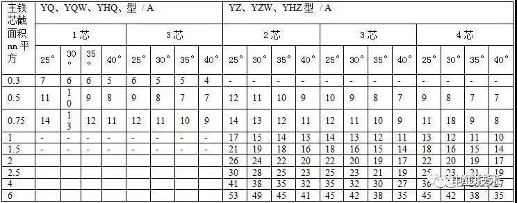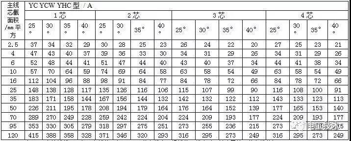 通用橡套軟電纜的載流量(450V/750V及以下橡膠絕緣電力電纜YQ、YQW、YHQ、YC、YCW、YHC型號(hào)的載流量
